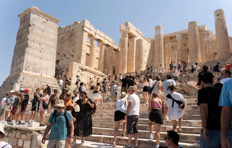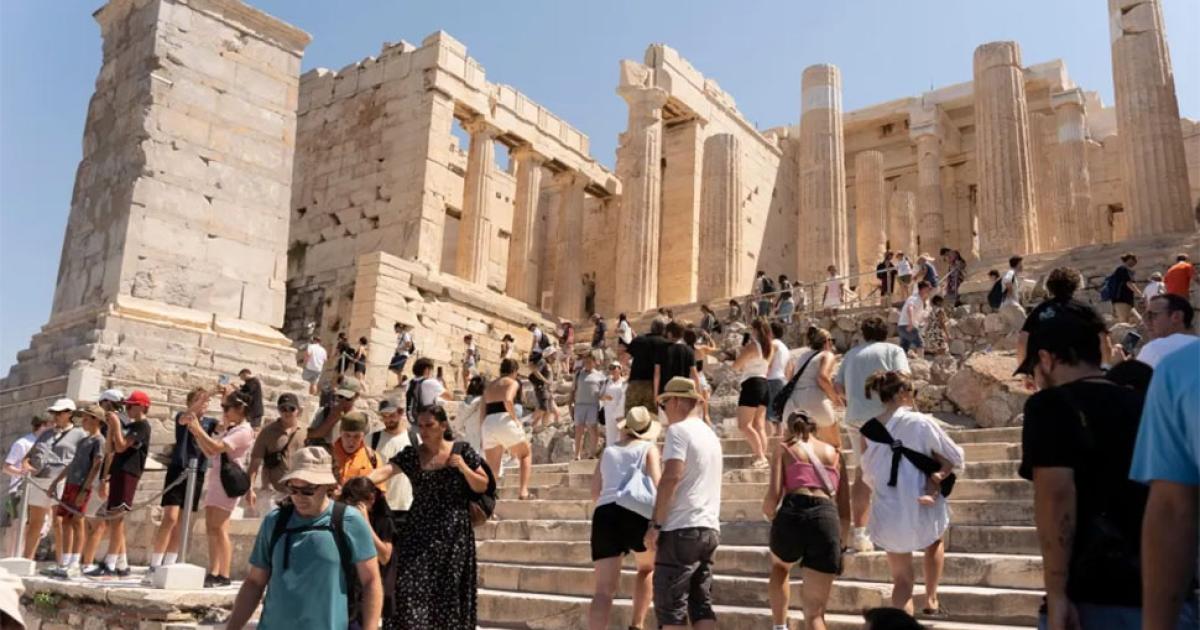 Ο καύσωνας δεν στάθηκε εμπόδιο για εκατοντάδες τουρίστες που ανέβηκαν το πρωί στον Ιερό Βράχο της Ακρόπολης, αψηφώντας τις υψηλές θερμοκρασίες και τον καυτό ήλιο. Εξοπλισμένοι με καπέλα, ανεμιστηράκια, ομπρέλες, μαντήλια, βεντάλιες και φυσικά νερό, επισκέπτες από κάθε γωνιά του κόσμου κατέφτασαν από νωρίς για να θαυμάσουν τα μνημεία, την ώρα που το θερμόμετρο ξεπερνούσε τους 35 βαθμούς Κελσίου.