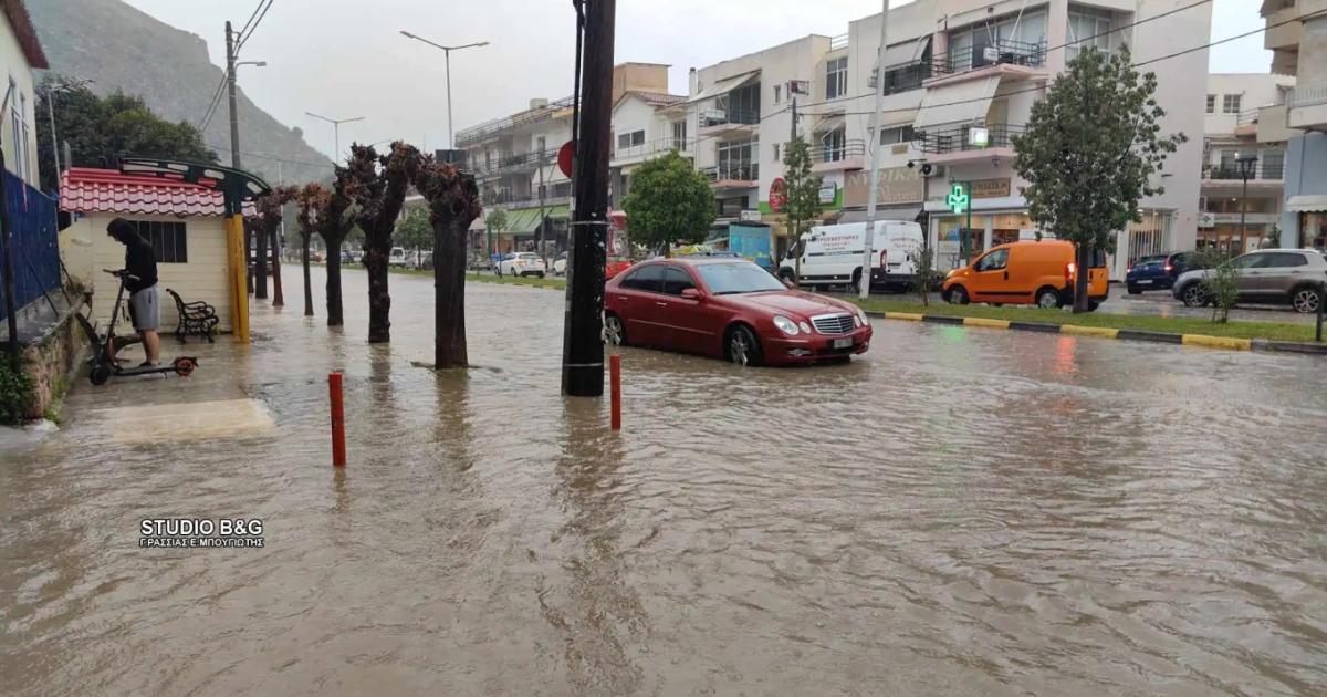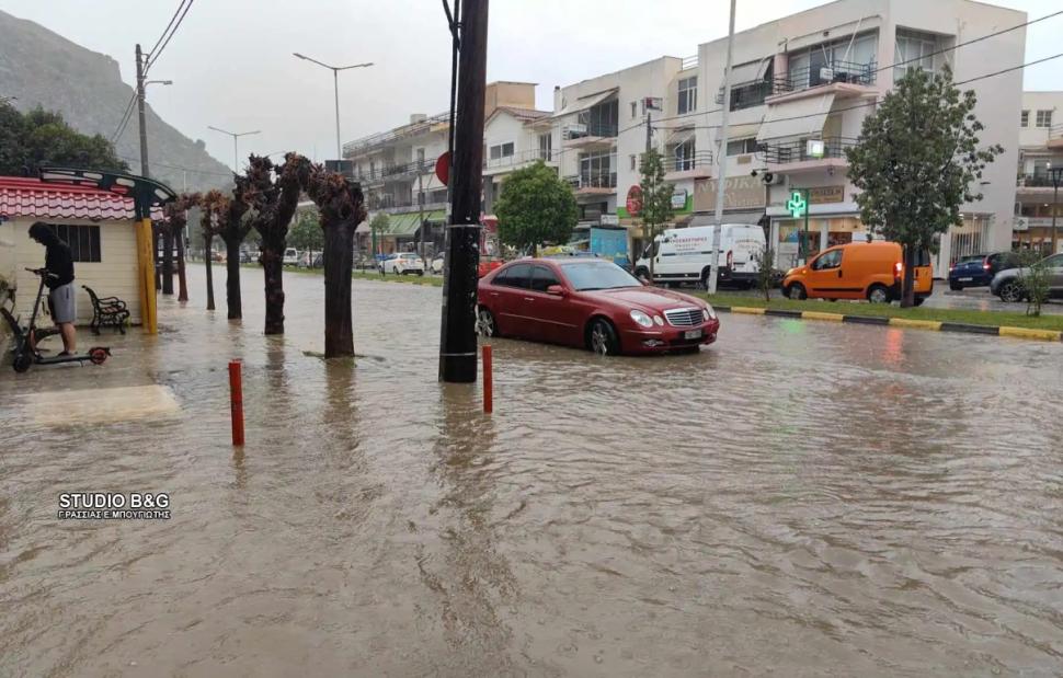 Πλημμύρες σε δρόμους του Ναυπλίου προκάλεσε η κατά διαστήματα καταρρακτώδης βροχή που πέφτει από το πρωί λόγω της κακοκαιρίας «Emil».