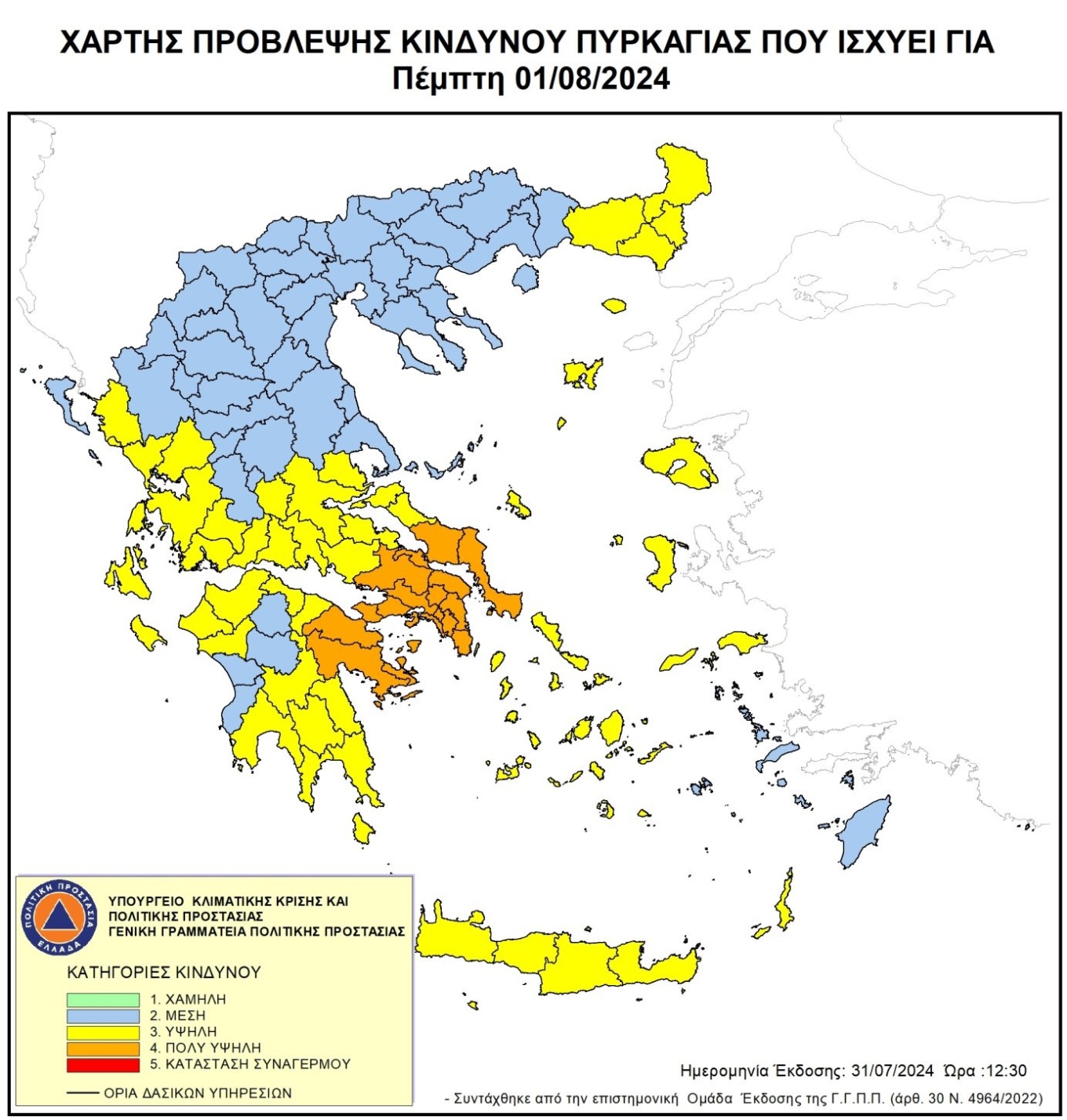 Πολύ υψηλός κίνδυνος πυρκαγιάς (κατηγορία κινδύνου 4) προβλέπεται την Πέμπτη στην περιφέρεια Αττικής καθώς και περιοχές της Στερεάς Ελλάδας και της Πελοποννήσου σύμφωνα με το Χάρτη Πρόβλεψης Κινδύνου Πυρκαγιάς που εκδίδει η γενική γραμματεία Πολιτικής Προστασίας του υπουργείου Κλιματικής Κρίσης και Πολιτικής Προστασίας.