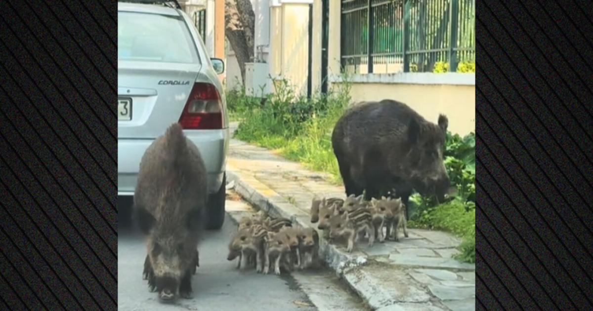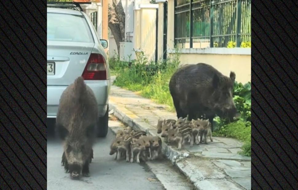 Σε βίντεο που κάνει τον γύρο του διαδικτύου φαίνονται τα δύο μεγάλα αγριογούρουνα να περπατάνε, έχοντας ανάμεσά τους πάνω από δέκα μικρά.