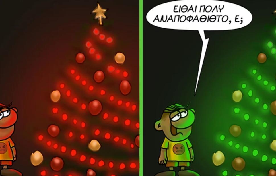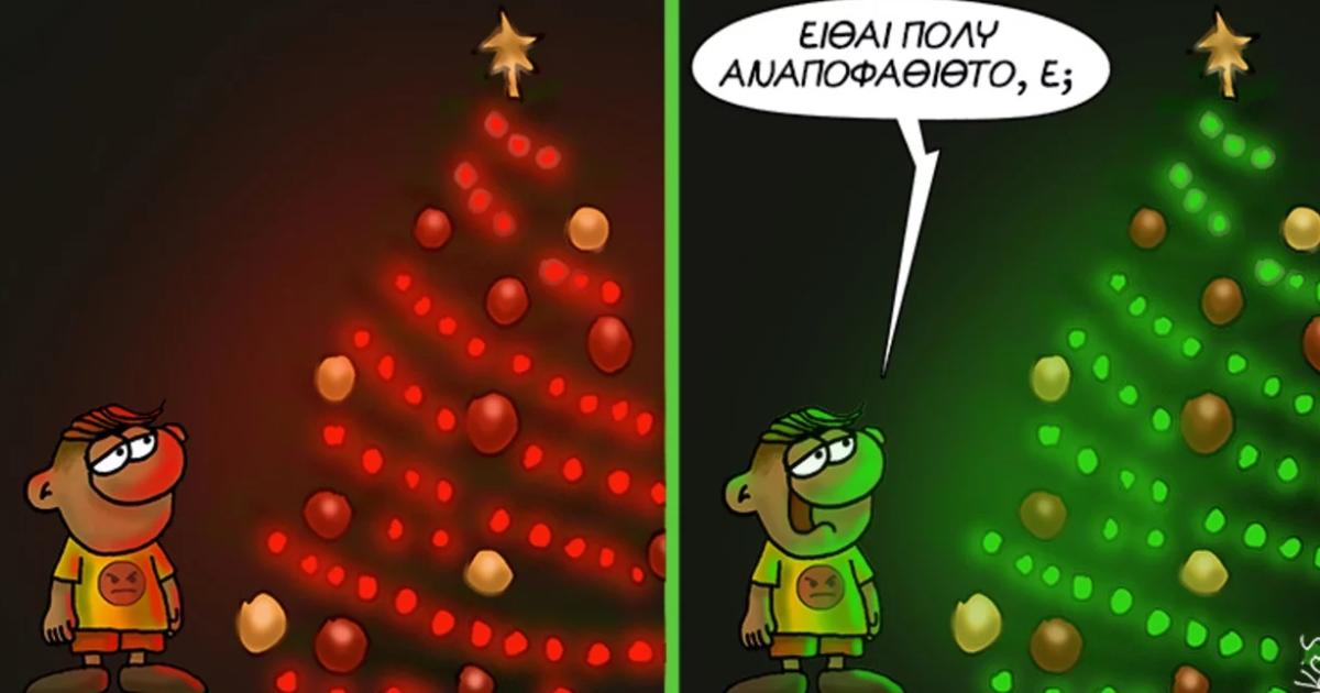 Στο σκίτσο του δύο χριστουγεννιάτικα δέντρα, ένα με κόκκινα φωτάκια και ένα με πράσινο. Και τα δύο καίνε ρεύμα. Και ο Θανασάκης σχολιάζει: «Είσαι πολύ αναποφάθιθτο, ε;».