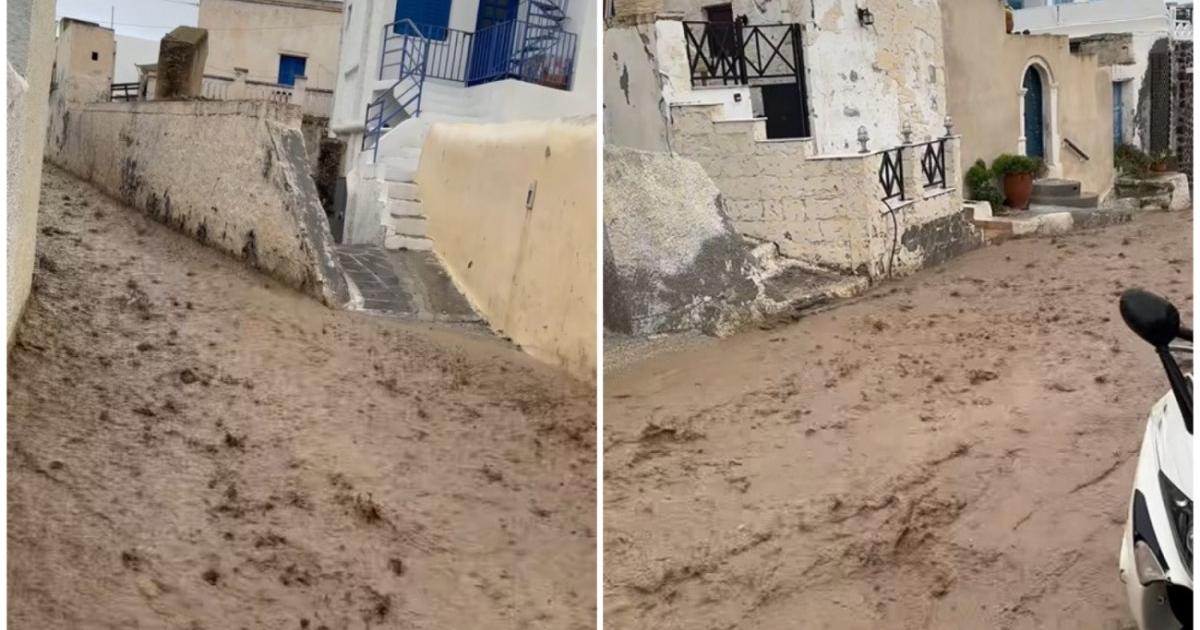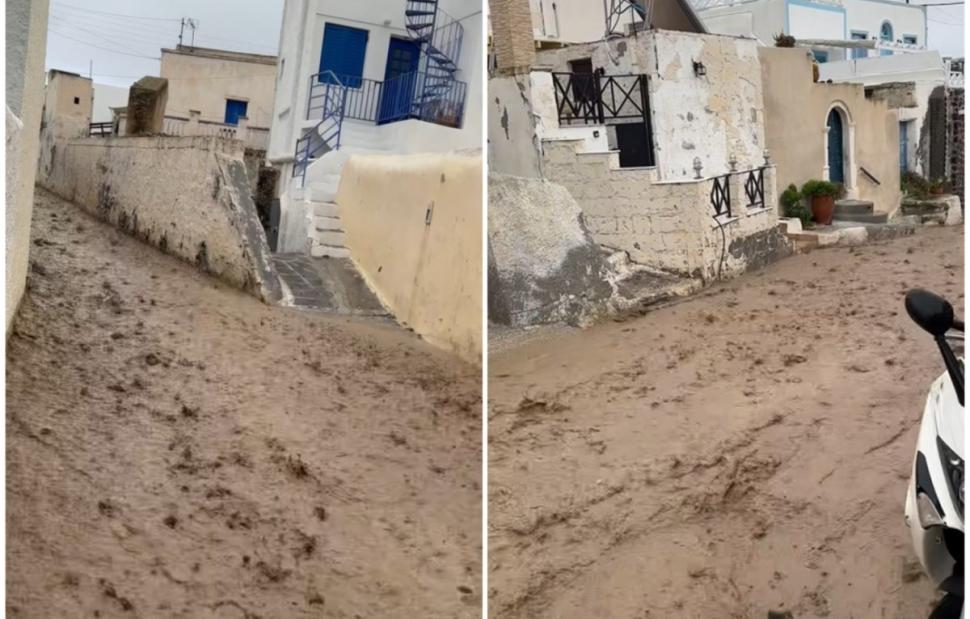 Σε ποτάμια μετατράπηκαν οι δρόμοι σε αρκετές περιοχές της Σαντορίνης, μετά την έντονη βροχόπτωση που σημειώθηκε νωρίτερα στο νησί.