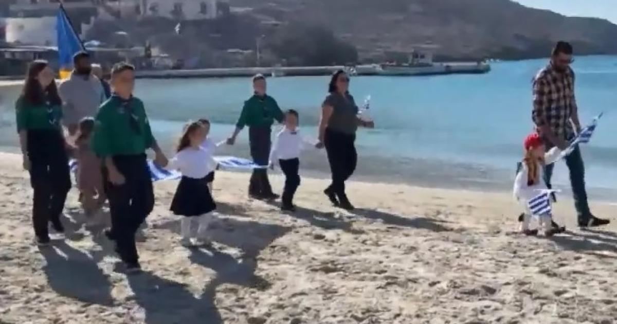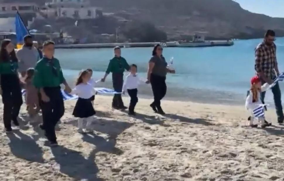 Η παρέλαση έγινε μπροστά σε παραλία του νησιού μαζί με προσκόπους από το 2ο Σύστημα Προσκόπων Αγίου Δημητρίου Αττικής.