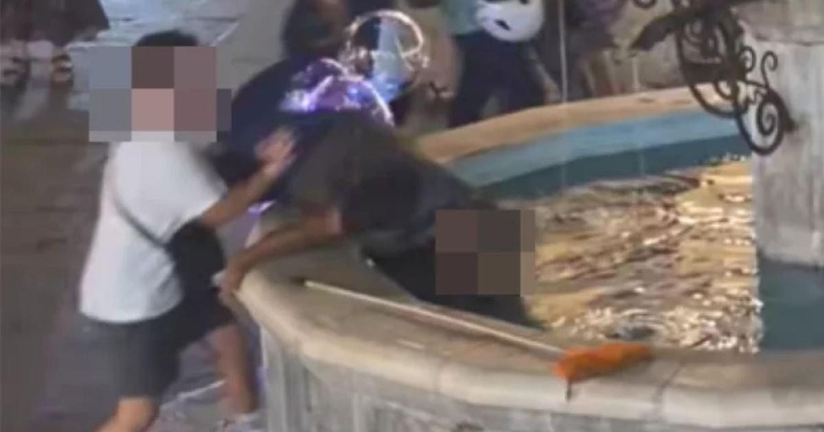 Στο βίντεο φαίνεται ο νεαρός να τον πλησιάζει, να τον σπρώχνει στο σιντριβάνι και ύστερα να απομακρύνεται από το σημείο.