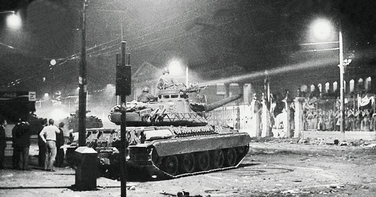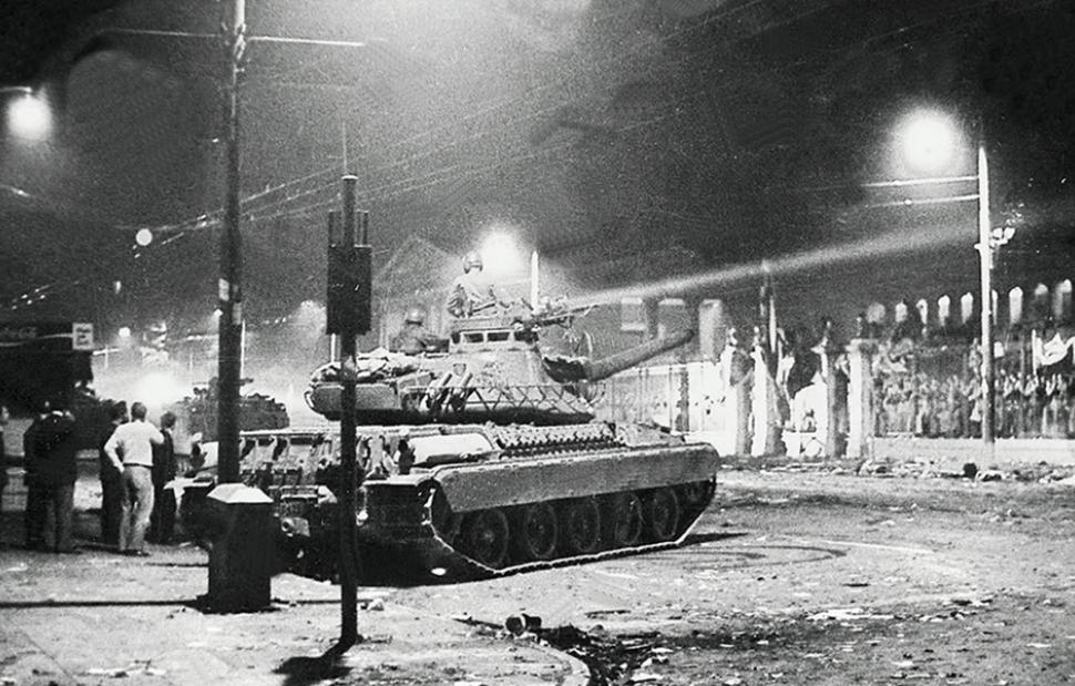1973: Το τανκ μπαίνει στο Πολυτεχνείο για να καταστείλει τη φοιτητική εξέγερση κατά της δικτατορίας και αφήνει πίσω του νεκρούς και τραυματίες.