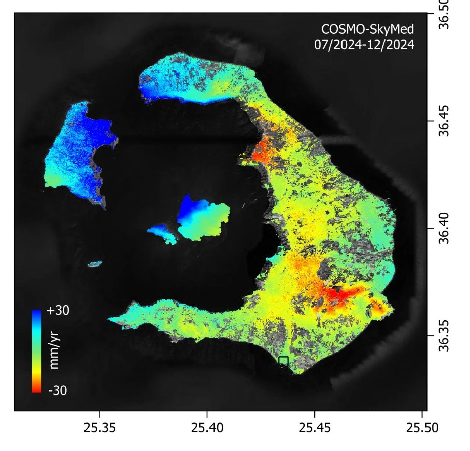 Eδαφική παραμόρφωση που εξελίχθηκε έως και τα τέλη του έτους και ενδείξεις δραστηριότητας στο βόρειο τμήμα της καλδέρας της Σαντορίνης τον Ιούλιο του 2024 δείχνουν τα πρώτα ευρήματα του Αριστοτελείου Πανεπιστημίου Θεσσαλονίκη. Κατά τη διάρκεια της έρευνας έγινε χρήση δορυφορικών δεδομένων ραντάρ COSMO-SkyMed σε συνεργασία με την ASI.