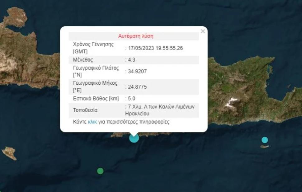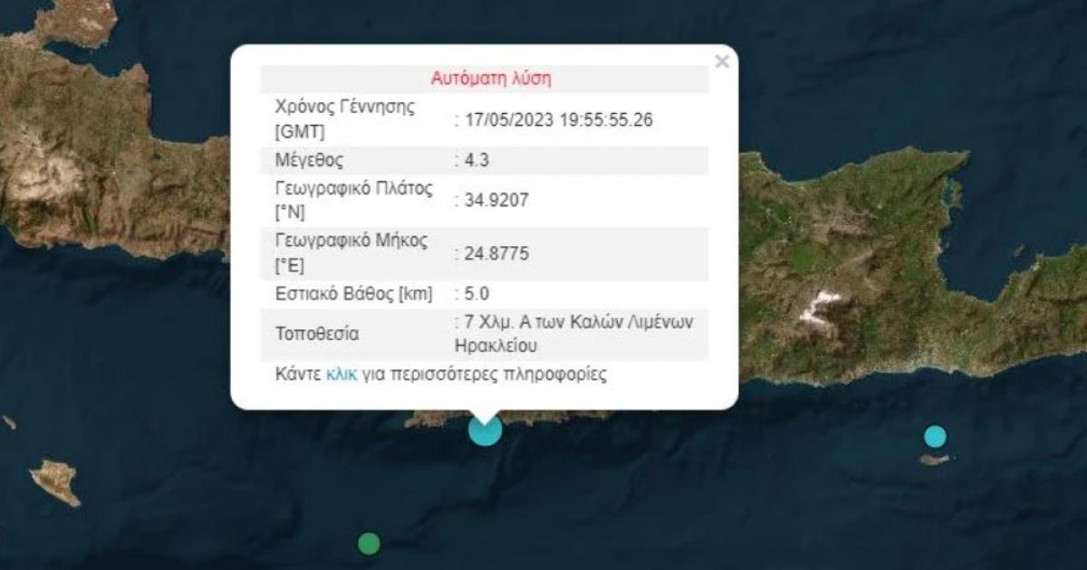 Σύμφωνα με την αυτόματη λύση του Γεωδυναμικού Ινστιτούτου Αθηνών, το επίκεντρο του σεισμού εντοπίζεται 7 χιλιόμετρα ανατολικά της των Καλών Λιμένων Ηρακλείου.