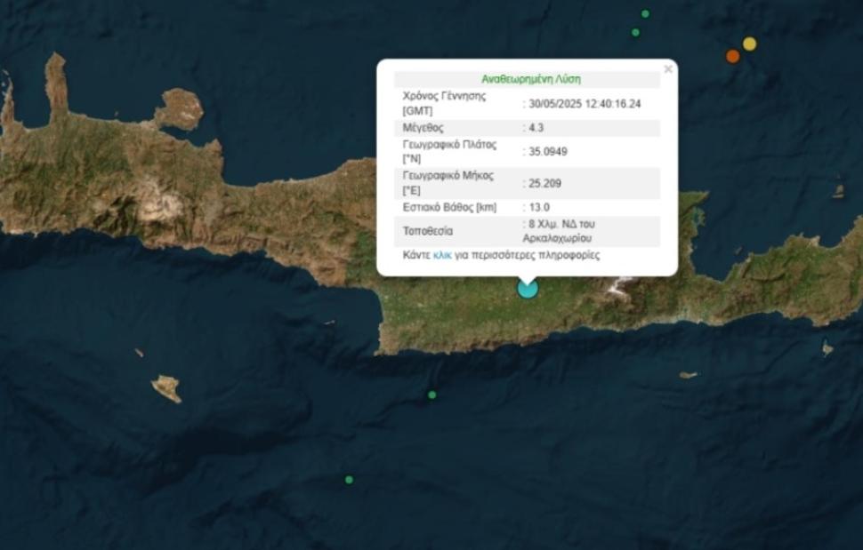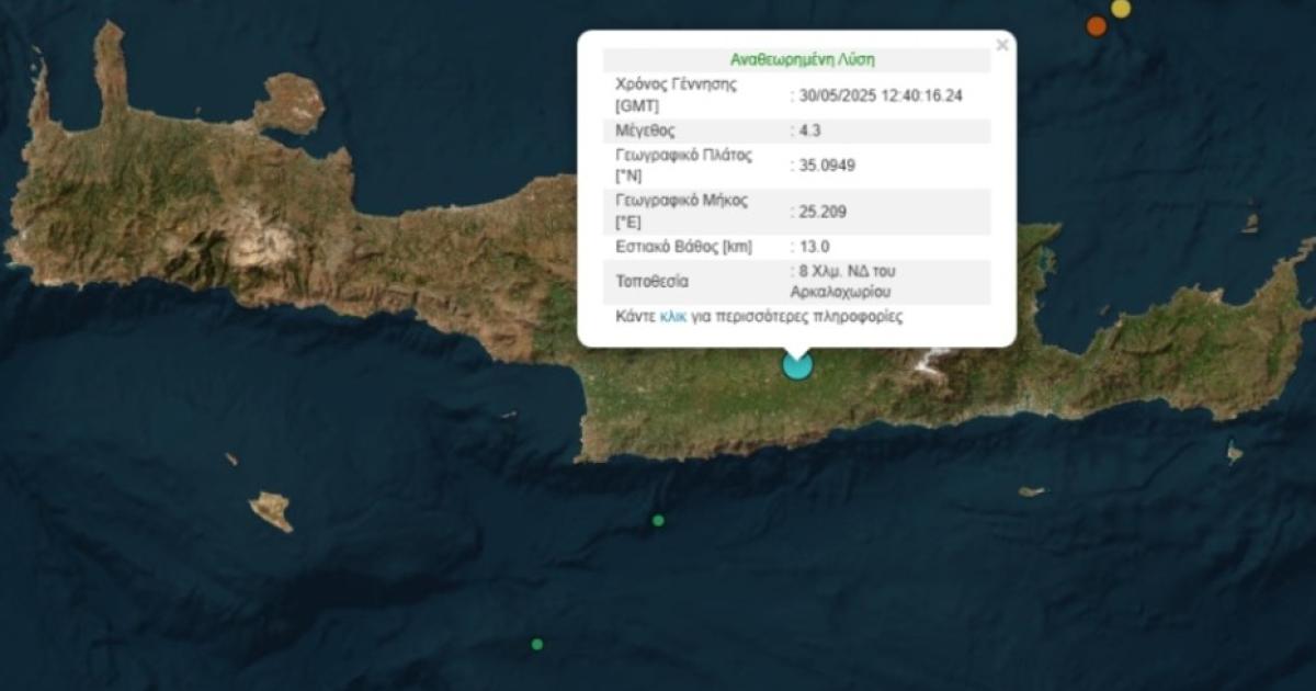 Σεισμική δόνηση μεγέθους 4,3 βαθμών της κλίμακας Ρίχτερ, ταρακούνησε την Κρήτη στις 15:40 της Παρασκευής, σύμφωνα με το Γεωδυναμικό Ινστιτούτο Αθηνών.