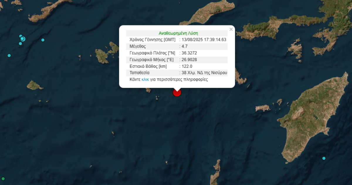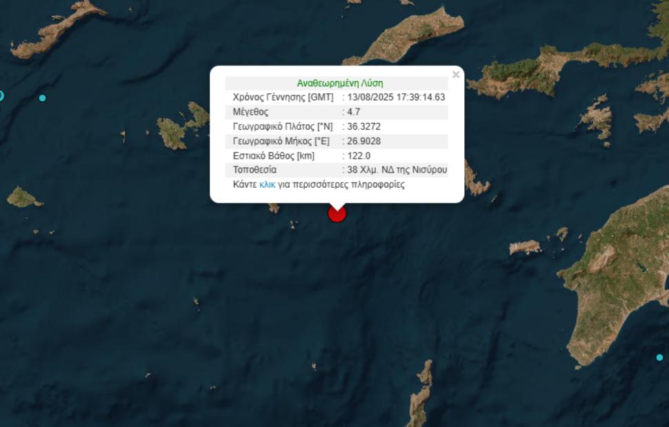 Σεισμική δόνηση 4,7 Ρίχτερ έγινε το βράδυ της Τετάρτης στα ανοιχτά της Νισύρου.