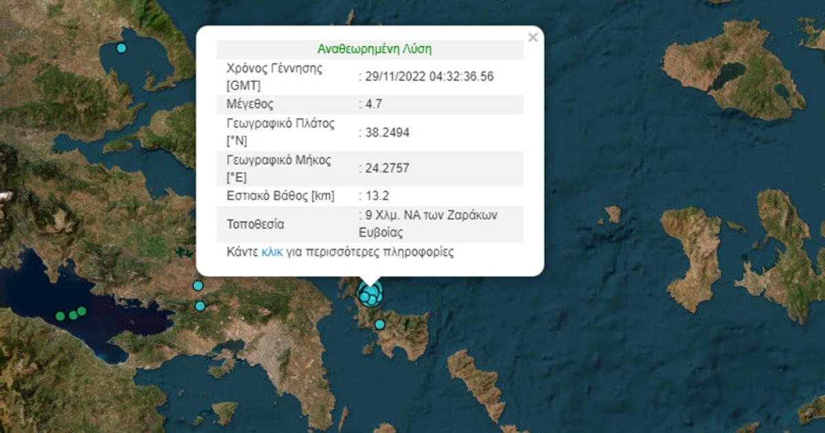 Σεισμός 4,7 Ρίχτερ σημειώθηκε λίγο μετά τις 6:30 το πρωί της Τρίτης ανοιχτά της Εύβοιας, με τη δόνηση να γίνεται αισθητή και στην Αττική.