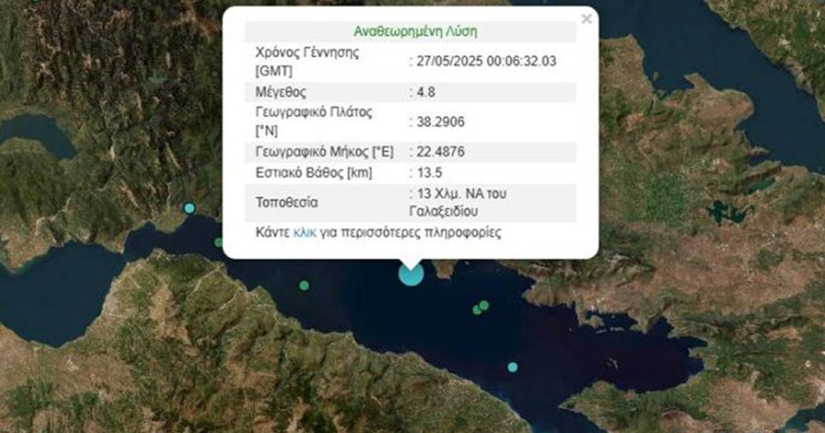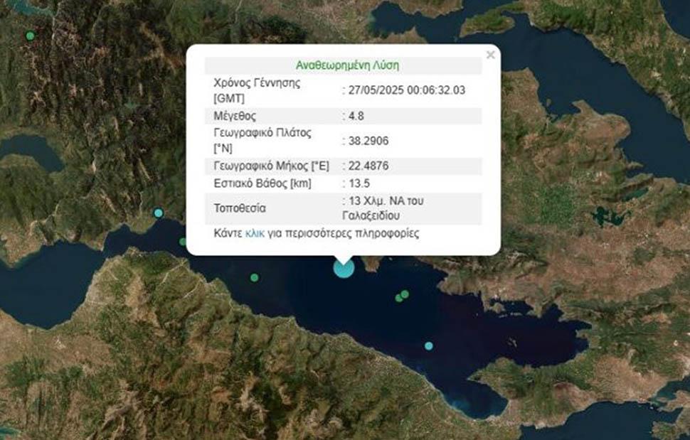 Σεισμός μεγέθους 4,8 βαθμών της κλίμακας Ρίχτερ σημειώθηκε στις 3:06 τα ξημερώματα στον Κορινθιακό κόλπο.