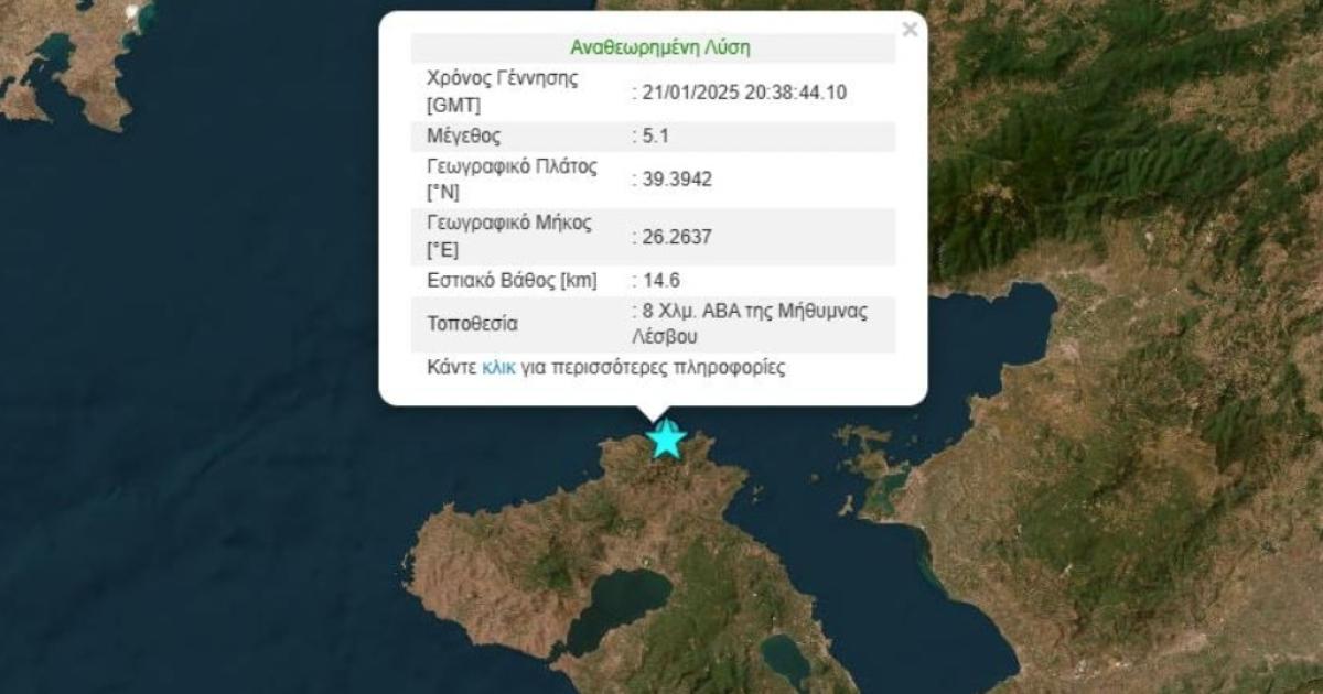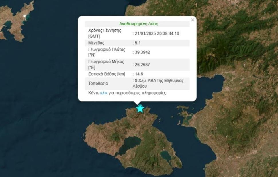 Ισχυρός σεισμός 5,1 βαθμών της κλίμακας Ρίχτερ σημειώθηκε στις 22:38 της Τρίτης στη Λέσβο.