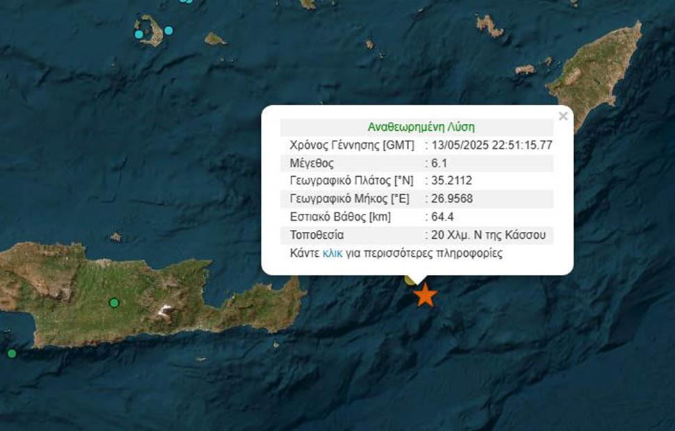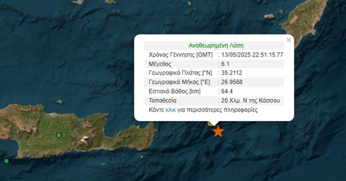 Αναστάτωση προκάλεσε περίπου στις 2 τα ξημερώματα ο ισχυρός σεισμός 6,1 Ρίχτερ που σημειώθηκε στον θαλάσσιο χώρο 20 χιλιόμετρα νότια-νοτιοδυτικά της Κάσου ή αλλιώς ανατολικά της Κρήτης, σε εστιακό βάθος 64,4 χιλιομέτρων, σύμφωνα με δεδομένα του Γεωδυναμικού Ινστιτούτου του Εθνικού Αστεροσκοπείου της Αθήνας.