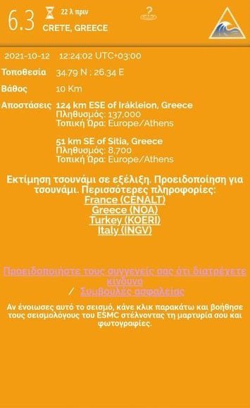 Προειδοποίηση για τσουνάμι εξέδωσε το Ευρωμεσογειακό Σεισμολογικό Κέντρο μετά τον σεισμό των 6,3 Ρίχτερ στη Κρήτη.