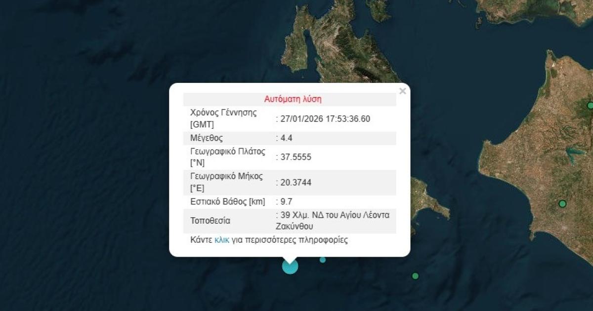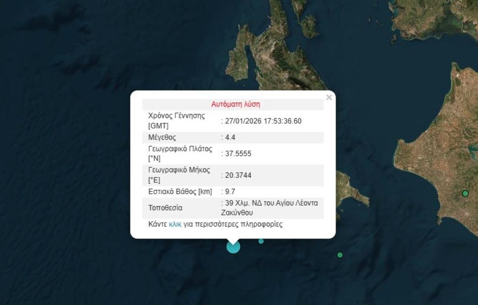 Σύμφωνα με το Γεωδυναμικό Ινστιτούτου το επίκεντρο της σεισμικής δόνησης εντοπίζεται στα 39 χιλιόμετρα νοτιοδυτικά του Αγίου Λέοντα Ζακύνθου.