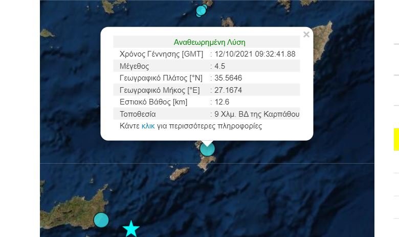 Ο σεισμός είχε μέγεθος 4,5 Ρίχτερ και είχε επίκεντρο 9 χιλιόμετρα βορειοδυτικά της Καρπάθου και εστιακό βάθος 12,6 χλμ.