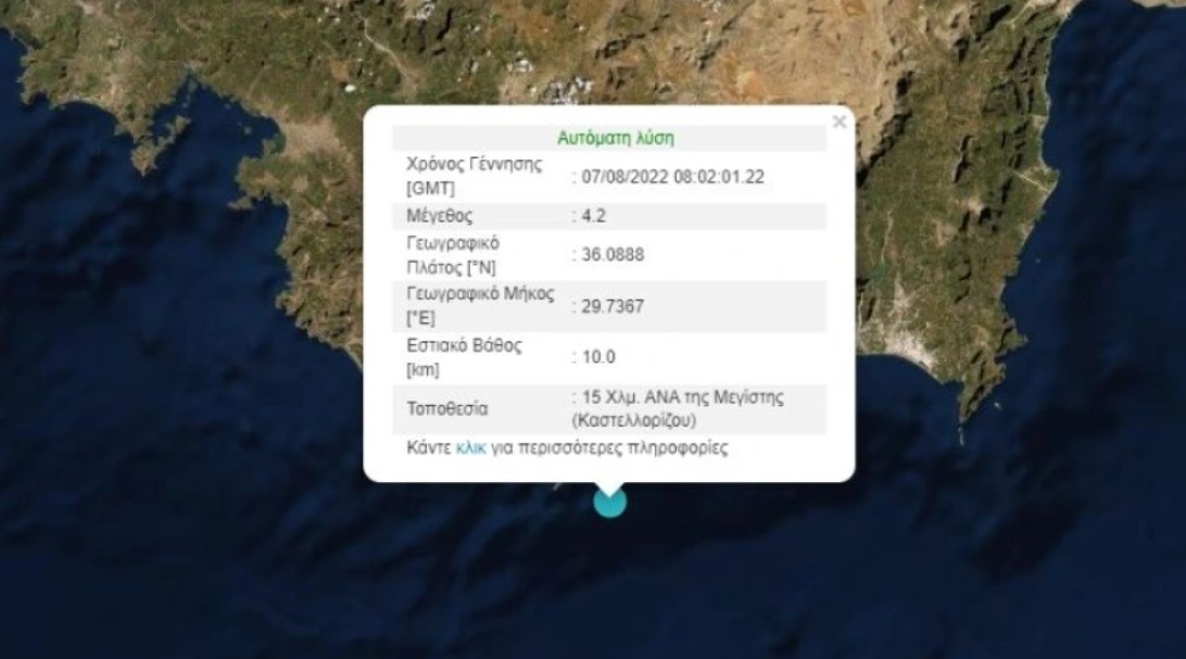 Ο σεισμός σημειώθηκε 15 χιλιόμετρα ανατολικά – νοτιοανατολικά της Μεγίστης και είχε εστιακό βάθος 10 χιλιόμετρα.