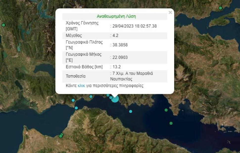 Σύμφωνα με το Γεωδυναμικό Ινστιτούτο Αθηνών, ο σεισμός σημειώθηκε στις 21:02 περίπου 7 χιλιόμετρα του Μαραθιά και είχε εστιακό βάθος 13,2 χιλιόμετρα.