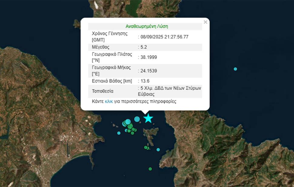Ισχυρή σεισμική δόνηση μεγέθους 5,2 βαθμών της κλίμακας Ρίχτερ σημειώθηκε λίγο πριν τις 00.30, με το επίκεντρο να εντοπίζεται στον θαλάσσιο χώρο ανοικτά των Νέων Στύρων Ευβοίας, σύμφωνα με το Γεωδυναμικό Ινστιτούτο του Εθνικού Αστεροσκοπείου Αθηνών.