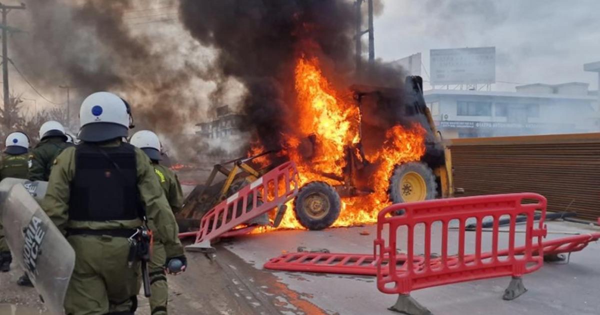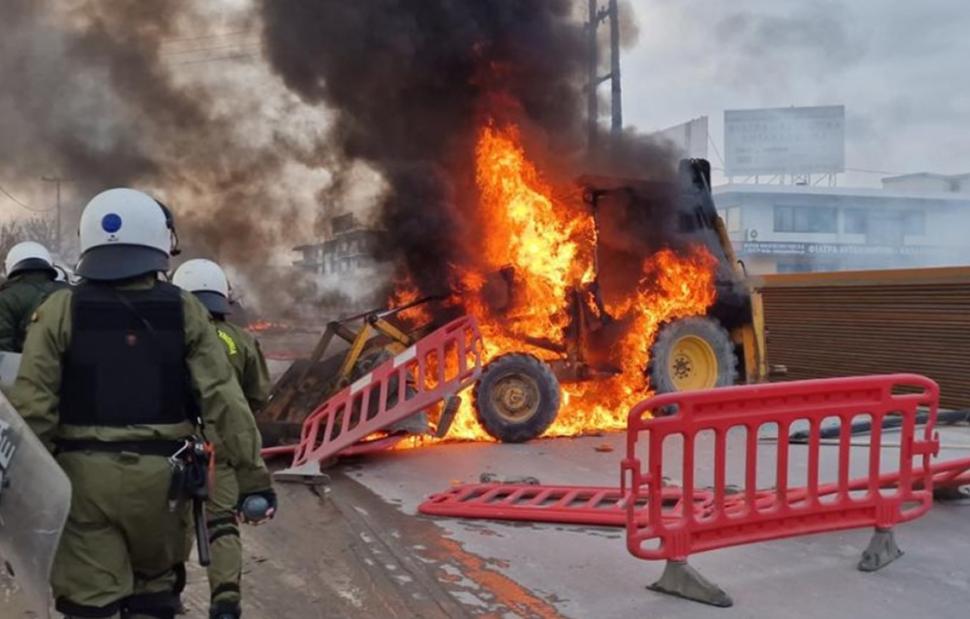Ακόμη, πυρπόλησαν δύο οχήματα εκσκαφέων. Οι αστυνομικοί των ΜΑΤ απάντησαν με χρήση χημικών και κρότου λάμψης.