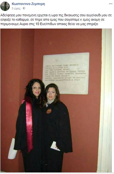 «Αδελφή μου πονεμένη έρχεται η ώρα της δικαίωσής σου αγγελούδι μου σε έσφαξε το κάθαρμα..σε πήρε από εμάς που σ' αγαπάμε κ εμείς ακόμη σε περιμένουμε. Αύριο στις 10 Ευελπίδων όποιος θέλει να μας στηρίξει», έγραψε σε ανάρτησή της στον Facebook.