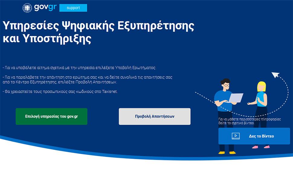 Διαθέσιμη στους πολίτες για την επικοινωνία και την υποβολή ερωτημάτων και αιτημάτων σχετικά με τη χρήση των ψηφιακών υπηρεσιών των φορέων είναι η ψηφιακή πλατφόρμα support.gov.gr. Η υπηρεσία σχεδιάστηκε και υποστηρίζεται από την Γενική Γραμματεία Πληροφοριακών Συστημάτων Δημόσιας Διοίκησης και την Γενική Γραμματεία Ψηφιακής Διακυβέρνησης και Απλούστευσης Διαδικασιών του Υπουργείου Ψηφιακής Διακυβέρνησης.