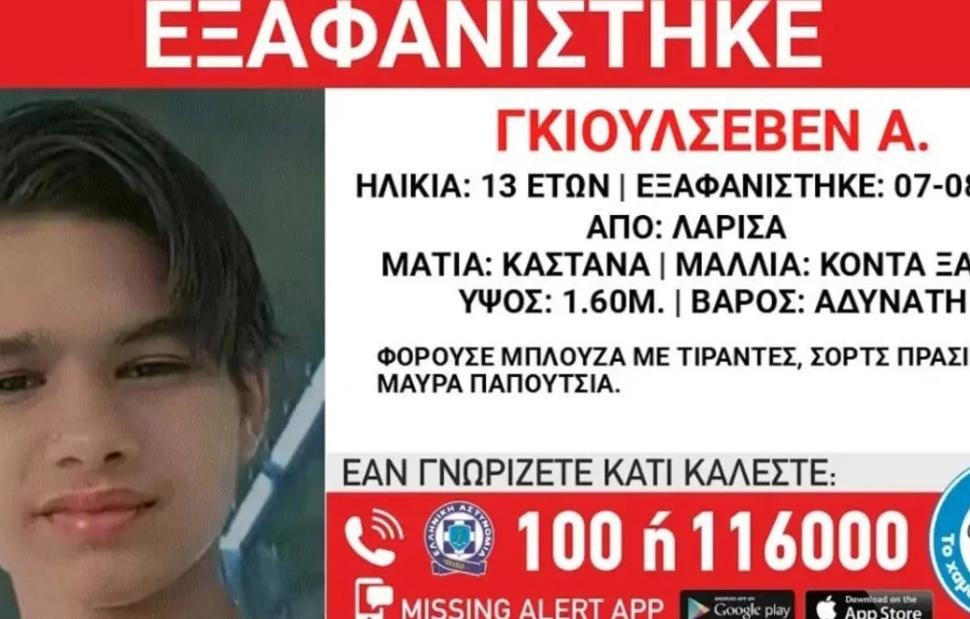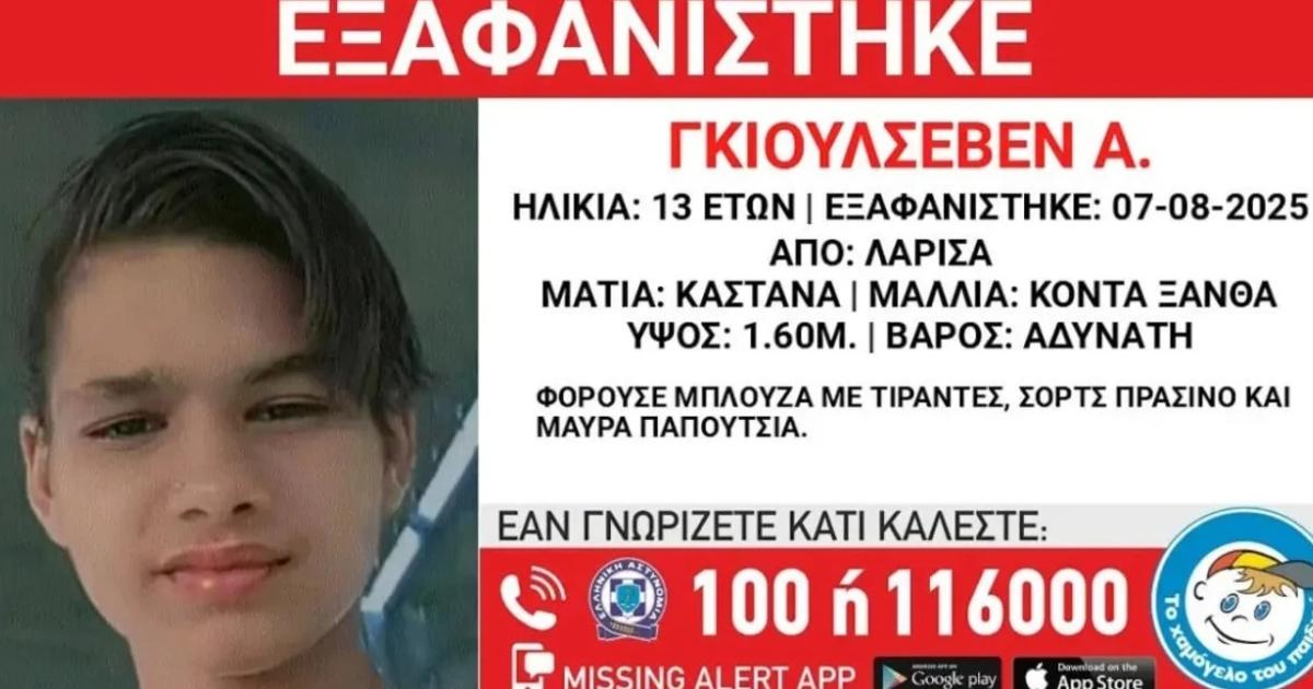 Μεγάλη κινητοποίηση της αστυνομίας στη Λάρισα μετά την εξαφάνιση της Γκιουλσεβέν Α., ηλικίας 13 ετών, όπως γνωστοποίησε το «Χαμόγελο του Παιδιού» με ανακοίνωσή του το βράδυ της Παρασκευής (15/8).
