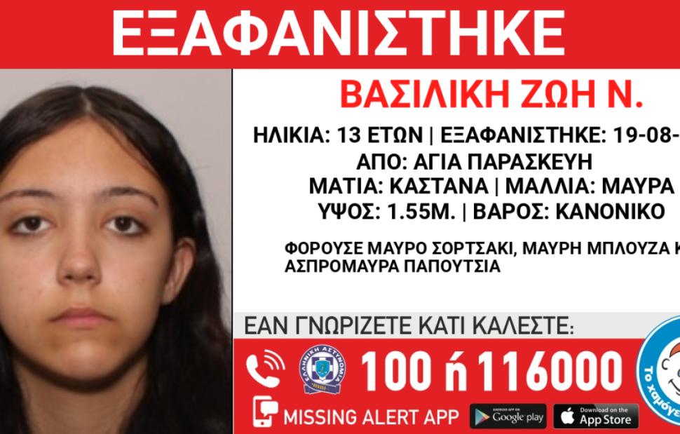 Στις 19/08/25, μεσημεριανές ώρες, εξαφανίστηκε από χώρο φιλοξενίας στην Αγία Παρασκευή η Βασιλική Ζωή Ν. 13 ετών.