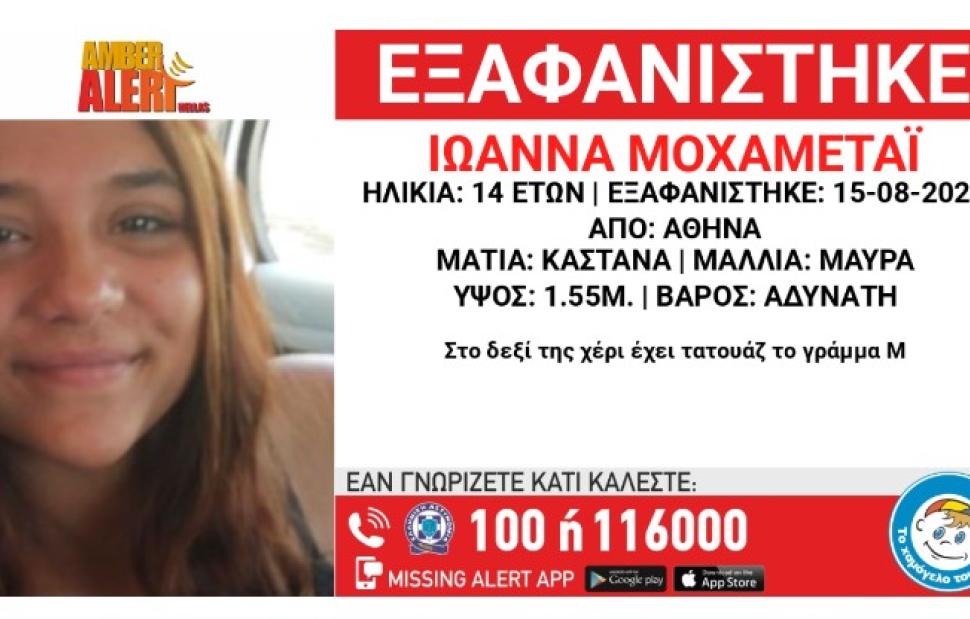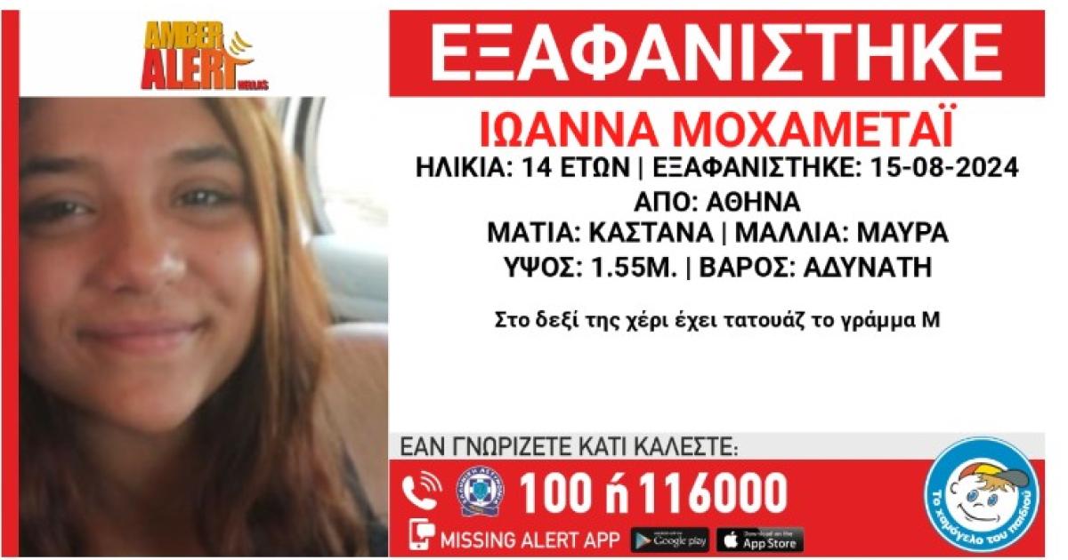 Συναγερμός έχει σημάνει στις αρχές για την εξαφάνιση της 14χρονης Ιωάννας Μοχαμεταϊ η οποία αγνοείται από την περιοχή της Αθήνας από τις 15 Αυγούστου 2024 και ώρα 19:25.