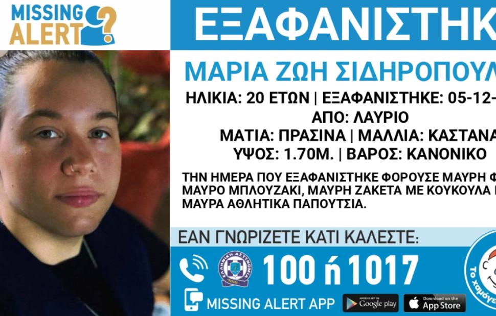 Μία κοπέλα 20 ετών εξαφανίστηκε από το Λαύριο, αναφέρει το Χαμόγελο του Παιδιού που προχώρησε στη δημοσιοποίηση των στοιχείων έπειτα από αίτημα της οικογένειας, καθώς ενδέχεται να συντρέχουν λόγοι οι οποίοι θέτουν τη ζωή της σε κίνδυνο.