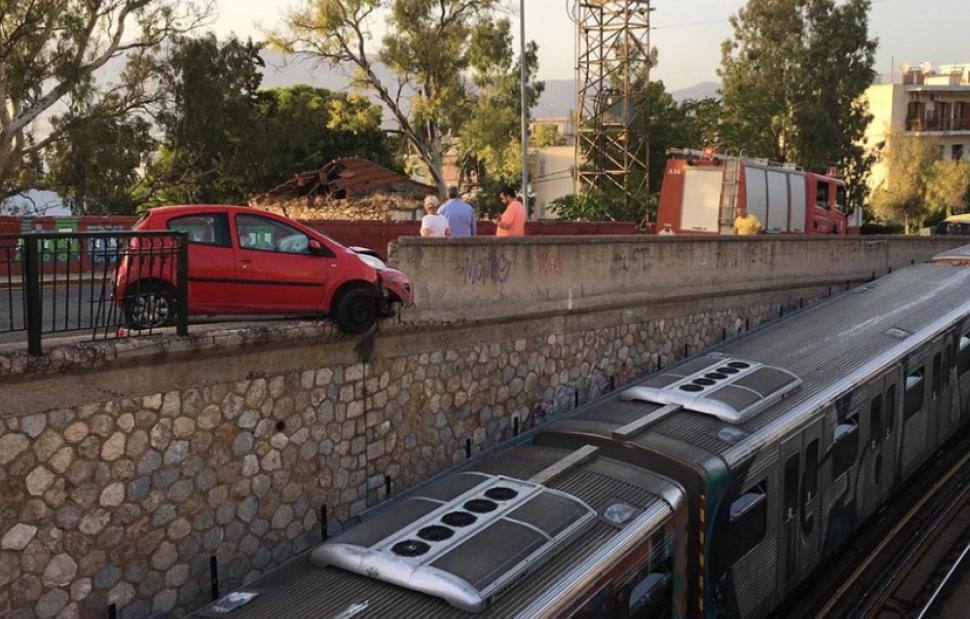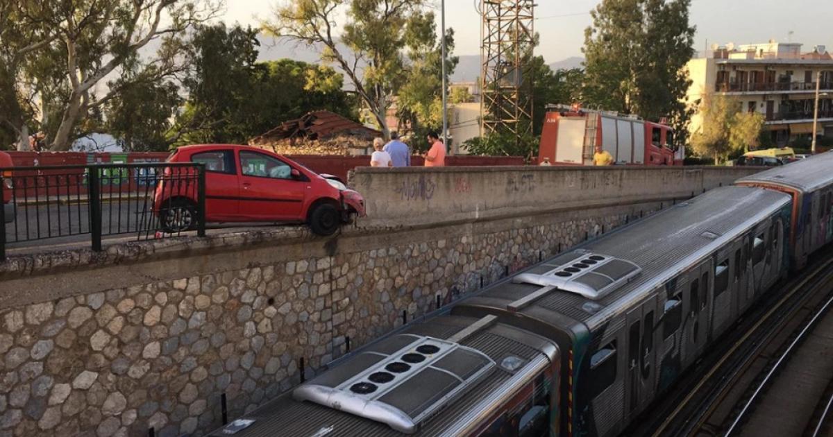 Οι πολίτες που έσπευσαν να βοηθήσουν είδαν το μικρό αυτοκίνητο να κρέμεται στο κενό, έτοιμο να πέσει στις γραμμές του Ηλεκτρικού.
