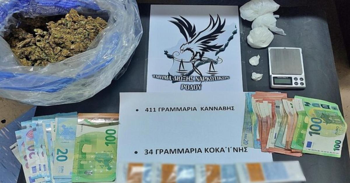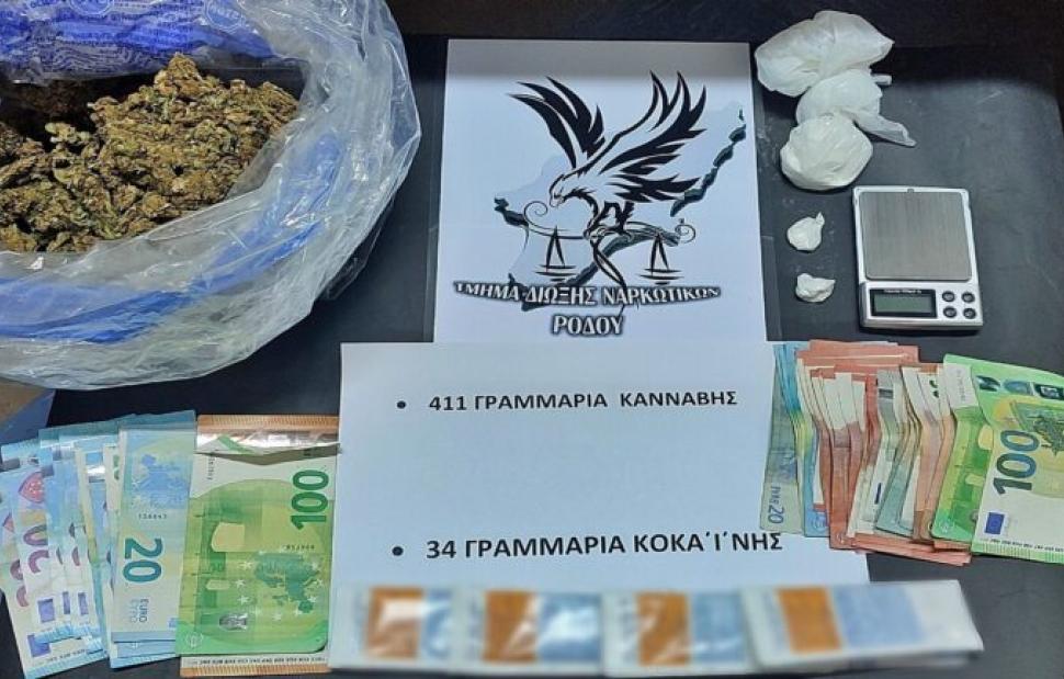 Σε έρευνα στην οικία του βρέθηκαν και κατασχέθηκαν, κοκαΐνη βάρους 34 γραμμάριων, κάνναβη (ακατέργαστη) βάρους 411 γραμμάριων, 17 συσκευασίες φαρμακευτικού σκευάσματος για νόθευση της κοκαΐνης, 2 ζυγαριές ακριβείας και το χρηματικό ποσό των 1.175 ευρώ.