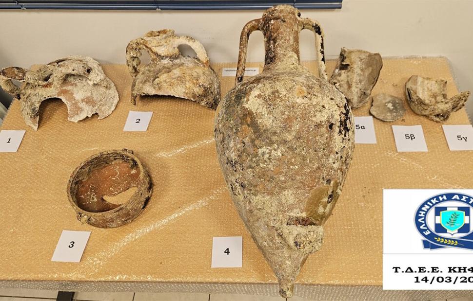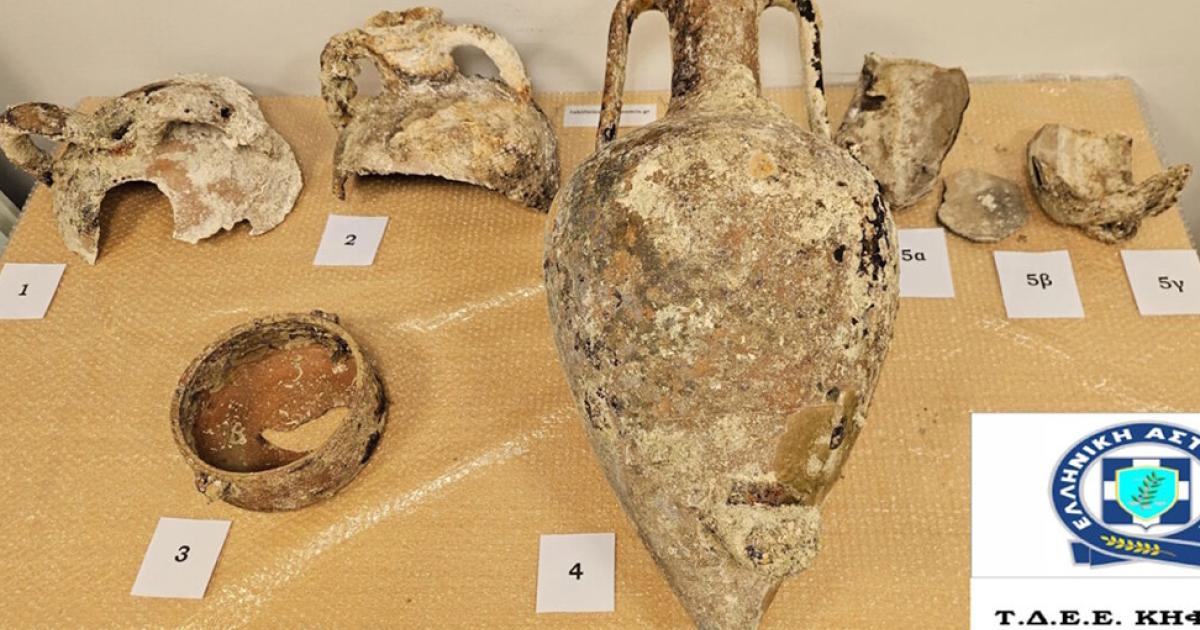 Από αστυνομικούς του Τμήματος Δίωξης και Εξιχνίασης Εγκλημάτων Κηφισιάς εντοπιστήκαν εντός οικίας ενός 50χρονου άνδρα, δέκα τμήματα ενάλιων αμφορέων που χρονολογούνται στην Ελληνιστική, την Βυζαντινή και τη Νεότερη Περίοδο