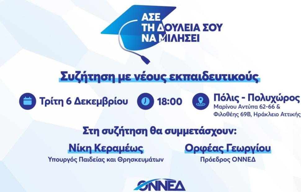 Η τρίτη σε σειρά ανοιχτή συζήτηση της ΟΝΝΕΔ αφορά τον κλάδο των εκπαιδευτικών και θα διεξαχθεί στη Θεατρική Σκηνή του Πολυχώρου Πόλις, την Τρίτη 6 Δεκεμβρίου στις 18.00 (επί της οδού Μαρίνου Αντύπα 62-66 & Φιλοθέης 69Β στο Ηράκλειο Αττικής).