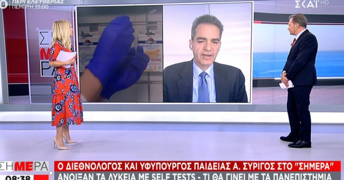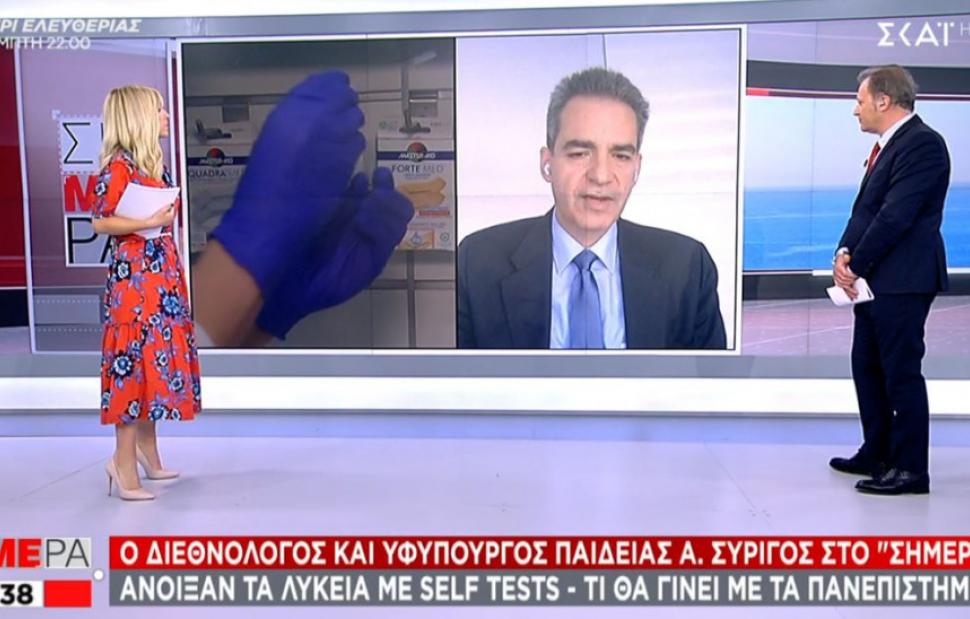 Ο υφυπουργός, μιλώντας στον ΣΚΑΪ, είπε πως υπάρχουν ορισμένοι τομείς όπως πρακτικές, κλινικές, εργαστηριακές ασκήσεις που θα φανεί στην συνέχεια πως θα μπορούσε να λειτουργήσει το αυτοδιαγνωστικό τεστ.