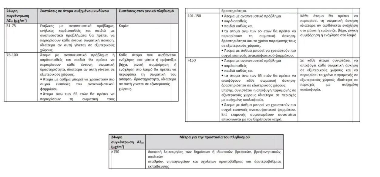 Ανάλογα με το επίπεδο των εκτιμώμενων 24ωρων συγκεντρώσεων των αιωρούμενων σωματιδίων, οι συστάσεις και τα μέτρα περιλαμβάνουν: