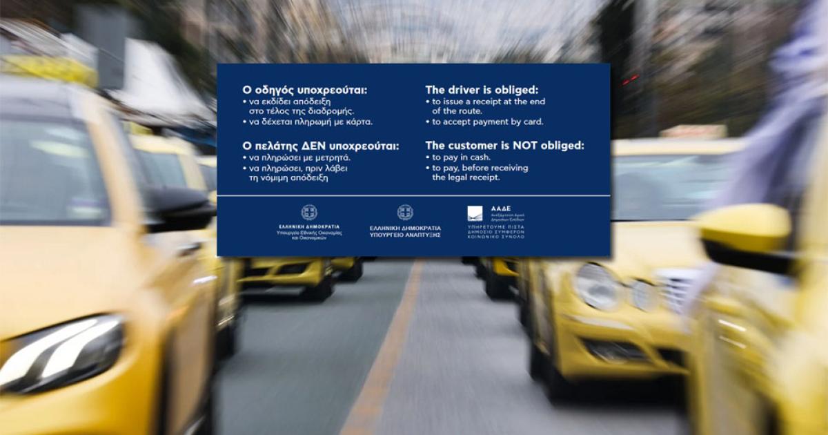 Την υποχρέωση των ΤΑΞΙ να αναρτούν ειδική σήμανση, με την οποία οι πελάτες ενημερώνονται για την υποχρέωση αποδοχής πληρωμών με κάρτα, και τη μορφή αυτής, καθορίζει απόφαση του Υφυπουργού Εθνικής Οικονομίας και Οικονομικών, Χρίστου Δήμα, κατόπιν πρότασης του Διοικητή της Ανεξάρτητης Αρχής Δημοσίων Εσόδων, Γιώργου Πιτσιλή.