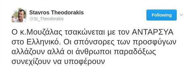 Η ανάρτηση του Σταύρου Θεοδωράκη: «O κ.Mουζάλας τσακώνεται με τον ΑΝΤΑΡΣΥΑ στο Ελληνικό. Οι σπόνσορες των προσφύγων αλλάζουν αλλά οι άνθρωποι παραδόξως συνεχίζουν να υποφέρουν».