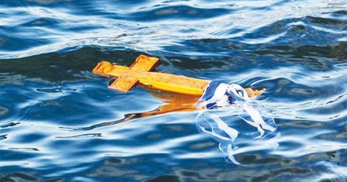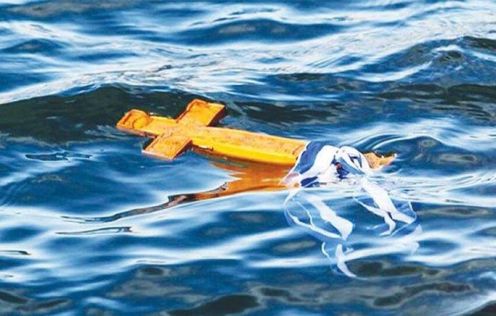 Ο τίμιος σταυρός ρίχτηκε από ένα φουσκωτό σκάφος, δεκάδες πολίτες μέσα στο νερό περίμεναν για να τον πιάσουν.