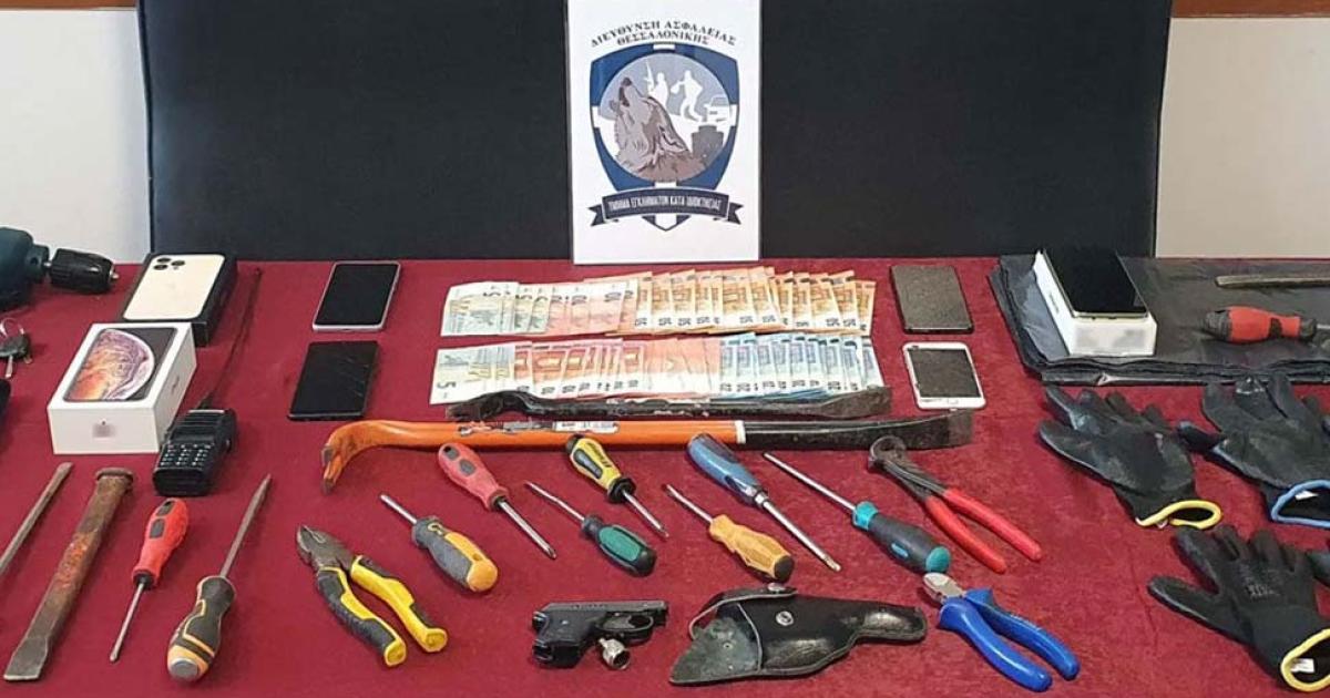 Σε κατ' οίκον έρευνες κατασχέθηκαν -μεταξύ άλλων- χρηματικά ποσά, διαρρηκτικά εργαλεία, ένας φορητός πομποδέκτης συντονισμένος στις συχνότητες της ΕΛ.ΑΣ., 230 ναρκωτικά χάπια, ένα πιστόλι κρότου και δύο αυτοκίνητα.