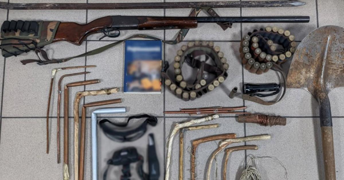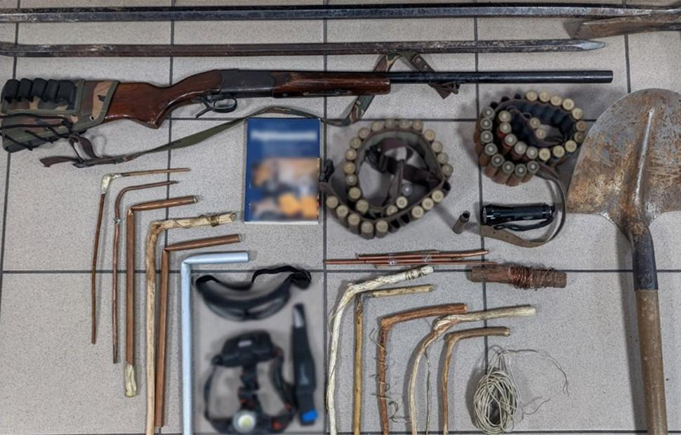 Σε έρευνες που έγιναν στον χώρο, σε σπίτια των κατηγορουμένων, όπως και σε σωματικές έρευνες, βρέθηκαν και κατασχέθηκαν φτυάρι, αξίνα και δύο μεταλλικοί λοστοί, κυνηγετική καραμπίνα με 50 φυσίγγια και μαχαίρι, αυτοσχέδιες ξύλινες και μεταλλικές ράβδοι διασκόπησης υπεδάφους, φακός κεφαλής, φακός, καλώδια, ζεύγος προστατευτικών γυαλιών εργασίας και βιβλίο ραβδοσκοπίας.