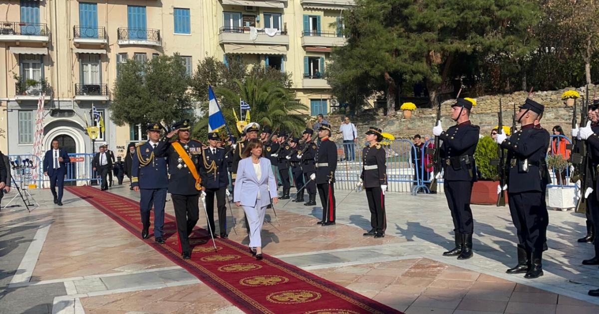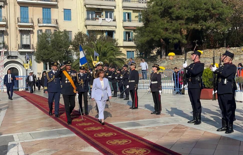 Στρατιωτικά αγήματα απέδωσαν τιμές και έγινε ανάκρουση του Εθνικού Ύμνου κατά την είσοδο της Προέδρου της Δημοκρατίας, Κατερίνας Σακελλαροπούλου, όπου παραδοσιακά υποδέχονται οι εκπρόσωποι της τοπικής αυτοδιοίκησης, μαζί με τον υφυπουργό Μακεδονίας-Θράκης, Κώστα Γκιουλέκα.