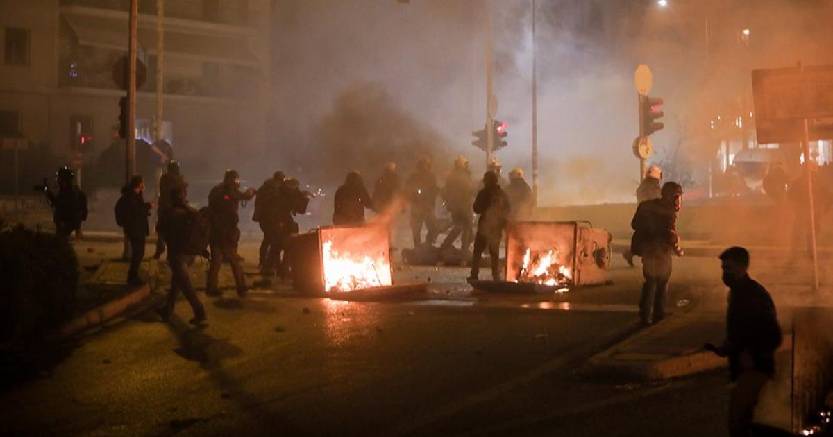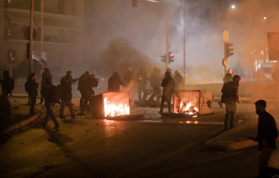 Λίγο μετά τις 19:15 το απόγευμα και ενώ ο μεγάλος όγκος των διαδηλωτών έφθανε στο αστυνομικό τμήμα, ομάδα κρανοφόρων έφυγε από τον κύριο όγκο της διαδήλωσης και φθάνοντας στο σημείο όπου αστυνομικοί είχαν στηθεί ως φραγμός, άρχισαν να πετούν βόμβες μολότοφ πέτρες, φωτοβολίδες καπνογόνα και ό,τι άλλο είχε μαζί της.