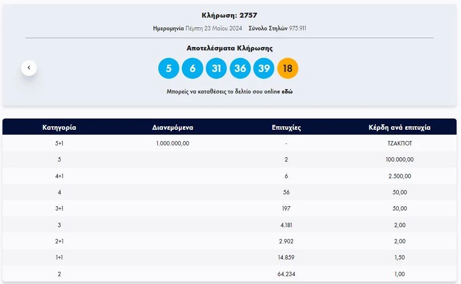 Τζακ ποτ σημειώθηκε στην πρώτη κατηγορία (5+1) του Τζόκερ στην κλήρωση 2757 της Πέμπτης.