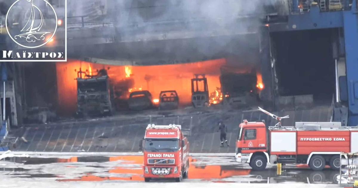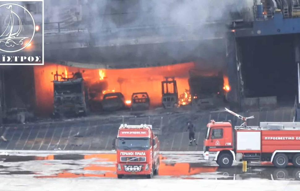 Η φωτιά στο γκαράζ του πλοίου, άρχισε να καταστρέφει ό,τι είχε απομείνει, με τις προσπάθειες της κατάσβεσης να βρίσκονται σε εξέλιξη μέχρι και το απόγευμα.