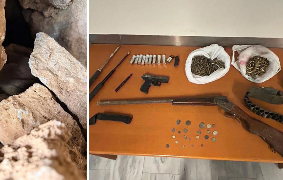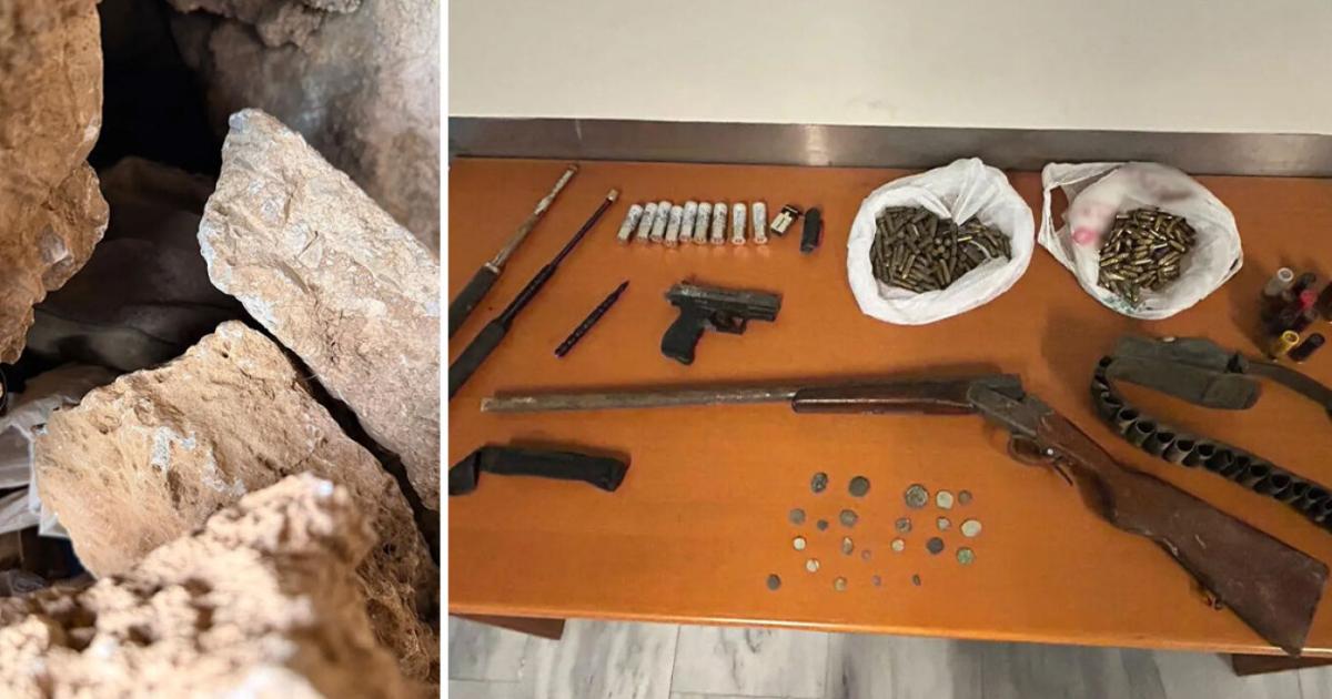 Πληροφορίες αναφέρουν ότι οι αστυνομικοί εντόπισαν σε σπηλιά σε χωράφι ιδιοκτησίας του, κοντά στα Βορίζια μία κυνηγετική καραμπίνα, πιστόλια και φυσίγγια. Ο γαμπρός του 39χρονου συνελήφθη για παράβαση του νόμου περί όπλων. Η είσοδος της σπηλιάς είχε «σφραγιστεί» με πέτρες και ξύλα, με τις Αρχές να εκτιμούν πως αυτό έγινε σχετικά πρόσφατα.