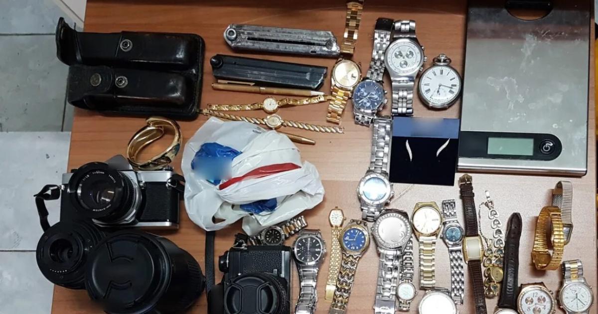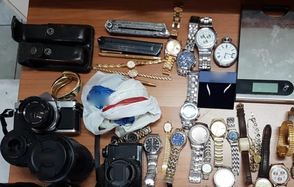 Σε έρευνα που διενεργήθηκε στο σπίτι της βρέθηκαν και κατασχέθηκαν: Πενήντα, ένας χρυσίζων αναπτήρας, 2 χρυσίζουσες αλυσίδες, 22 ζεύγη μανικετόκουμπων, 6 βραχιόλια, 10 στυλό συλλεκτικά, ένα ζευγάρι σκουλαρίκια, 7 επιχρυσωμένες εικόνες της ορθόδοξης εκκλησίας, ένα ιερό ευαγγέλιο σε ασημίζουσα θήκη, 7 πορτοφόλια, ένας φορητός ηλεκτρονικός υπολογιστής, 15 φωτογραφικές μηχανές, 5 εξαρτήματα φωτογραφικών μηχανών, 2 ζυγαριές ακριβείας, ένας φακός, 43 κλειδιά οικιών, μία πλαστελίνη με αποτυπώματα 2 πλευρών κλειδιού οικίας, μία συσκευή ανίχνευσης πολύτιμων ορυκτών, ένα βαλιτσάκι που περιέχει διαρρηκτικά εργαλεία, 7 συλλεκτικά ξίφη, 16 ξιφολόγχες, 3 αναδιπλούμενα μαχαίρια, ένα τσεκούρι, 2 πυροβόλα όπλα με δύο γεμιστήρες, 2 περίστροφα, ένα περίστροφο 22 χιλιοστών με αποξυσμένο αριθμο, ένα συλλεκτικό περίστροφο, το οποίο φέρει οξειδώσεις, 2 αεροβόλα όπλα με έναν γεμιστήρα, 2 γεμιστήρες σε θήκης με την ένδειξη ΕΒΟ, 173 φυσίγγια διαφόρων διαμετρημάτων, 8 φιαλίδια διοξειδίου του άνθρακα, 2 κουτιά που περιέχουν βολίδες αεροβόλου όπλου, ένα κινητό τηλέφωνο και διάφορα έγγραφα.