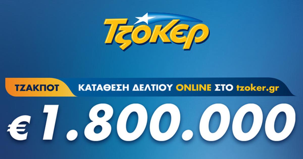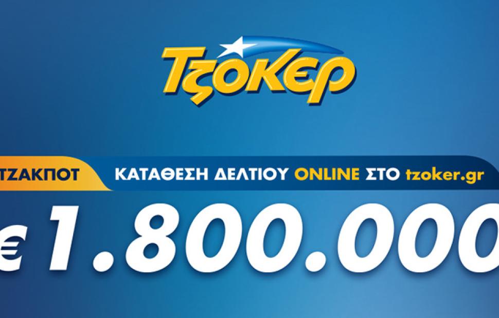 Σε 1,8 εκατ. ευρώ ανέρχεται το μεγάλο έπαθλο που αναμένεται να μοιράσει απόψε το ΤΖΟΚΕΡ στους νικητές της πρώτης της κατηγορίας. H συμμετοχή στην αποψινή κλήρωση, που θα πραγματοποιηθεί στις 22:00, γίνεται διαδικτυακά. Η προθεσμία κατάθεσης δελτίων τρέχει και οι παίκτες του ΤΖΟΚΕΡ μπορούν να καταθέτουν τα δελτία τους έως τις 21:30, από υπολογιστή ή κινητό τηλέφωνο, μέσω του tzoker.gr ή της εφαρμογής ΤΖΟΚΕΡ.