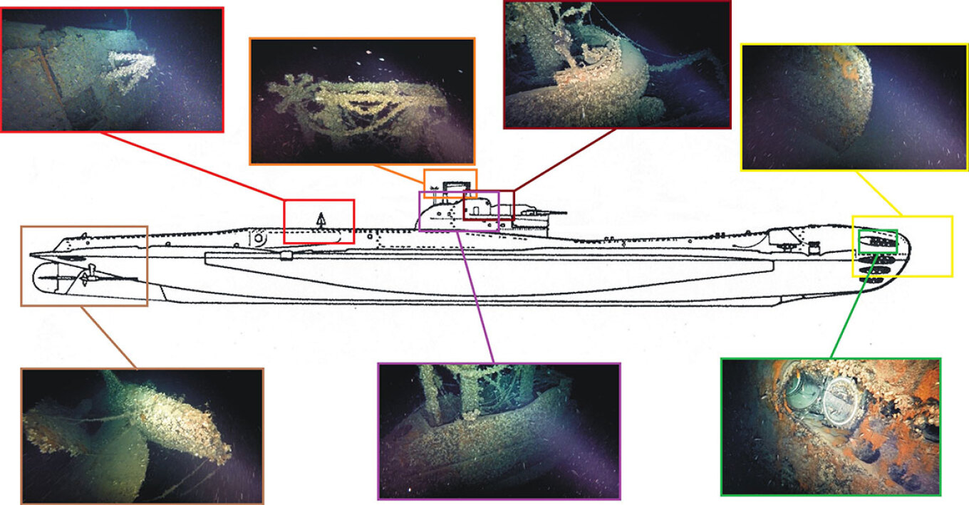 Η πλώρη και η πρύμνη κείτονται στο βυθό σε κοντινή απόσταση, ενώ ο πυργίσκος του υποβρυχίου έχει αποσπαστεί και βρίσκεται αρκετά πιο μακριά. Το σκηνικό είναι απόκοσμο...