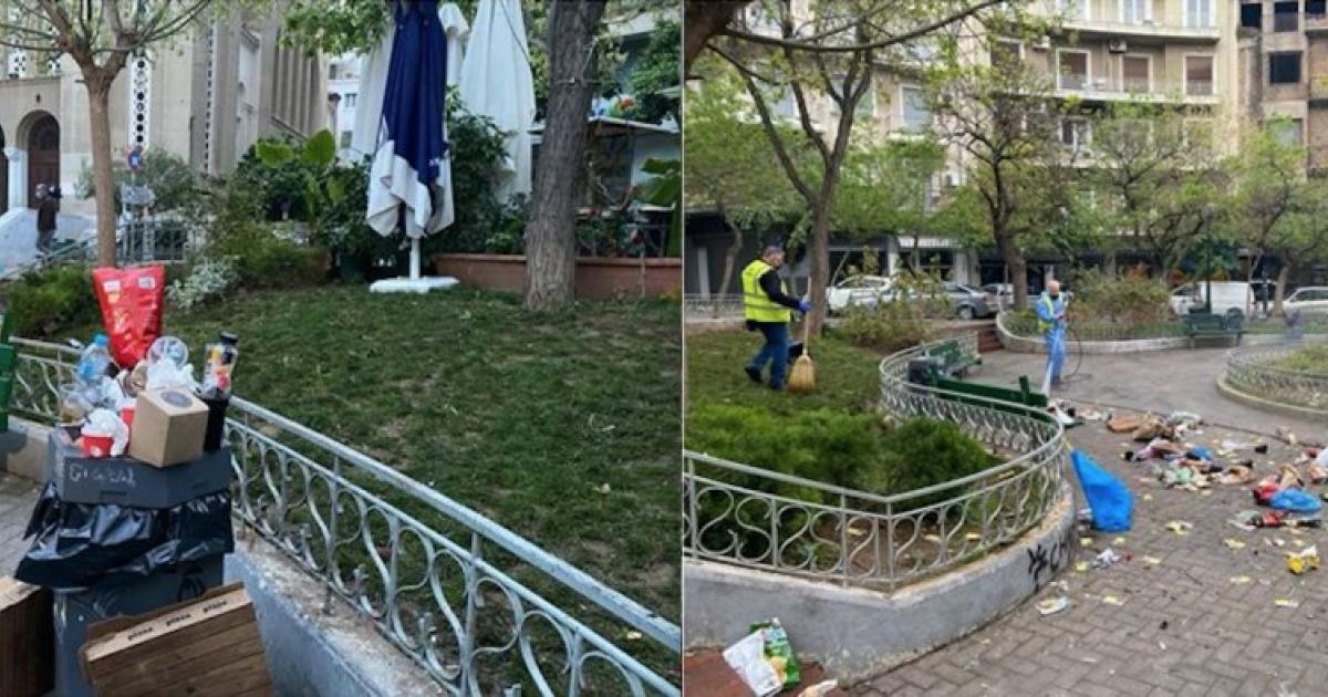 Τα συνεργεία καθαριότητας του δήμου Αθηναίων προσπαθούν να μαζέψουν από το πρωί το σκουπιδομάνι.